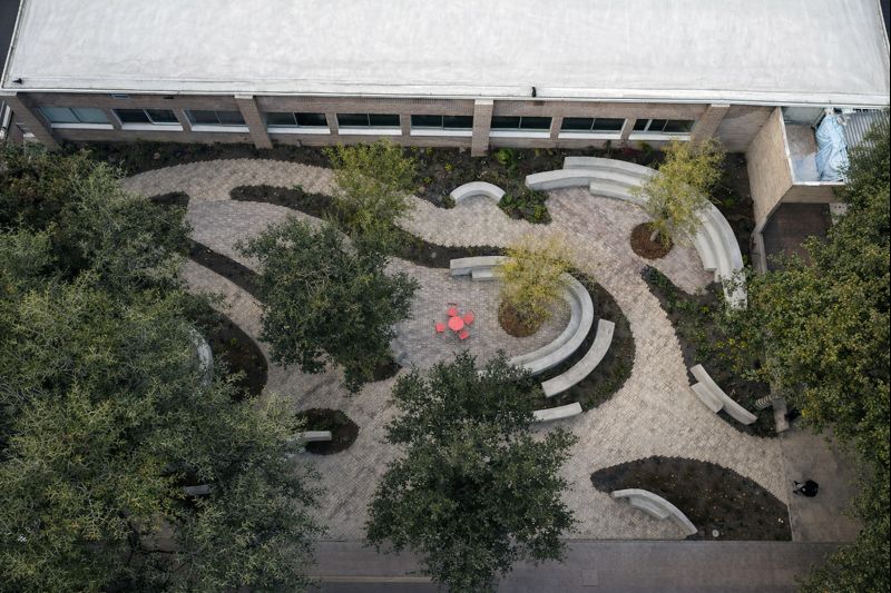 Área recreativa con andén peatonal, bancas de concreto e iluminación exterior.