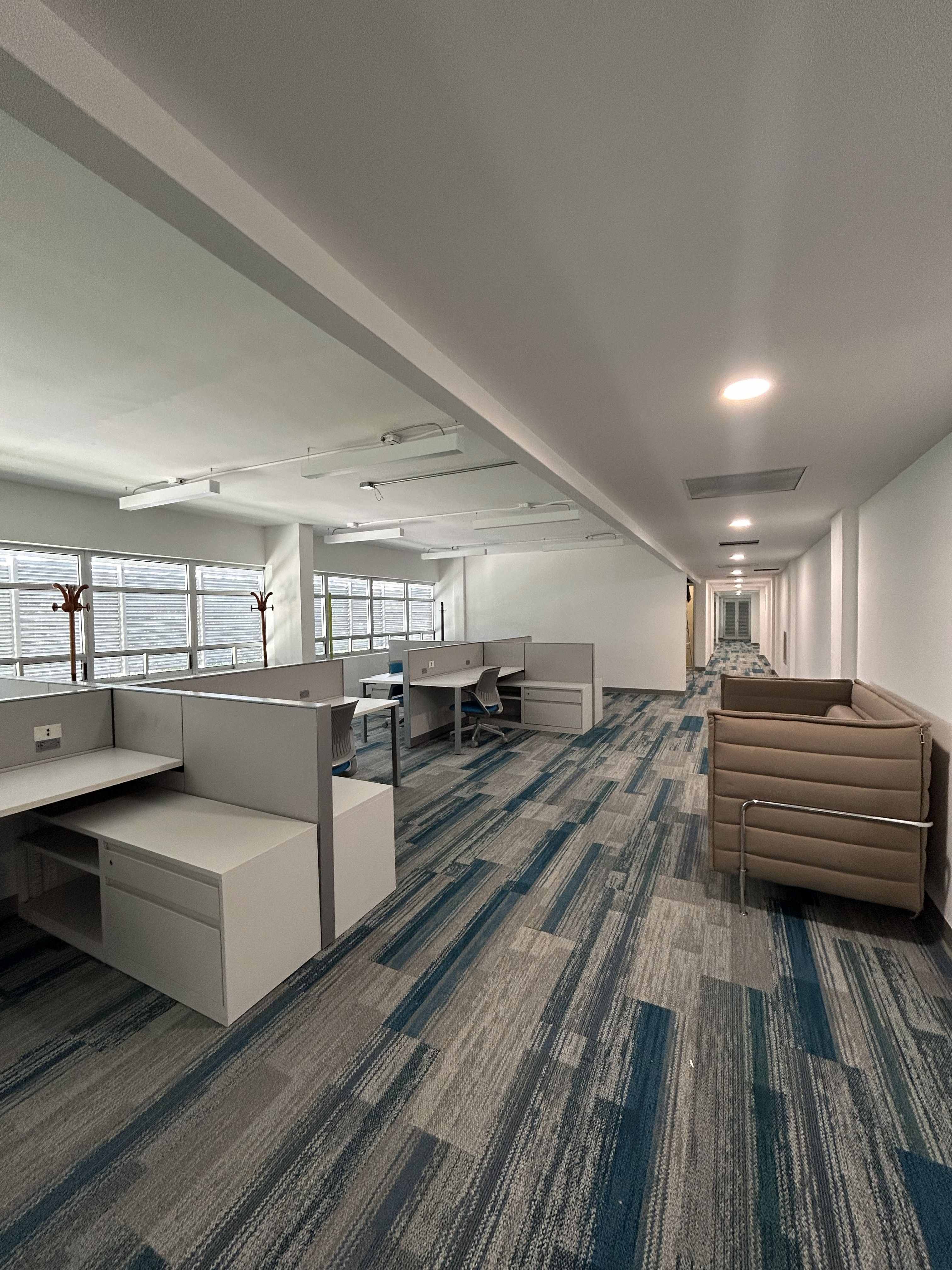 Espacio innovador para proyectos tecnológicos con mobiliario ergonómico y piso epóxico.